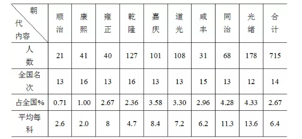 由表1可知,清代湖南进士总数居全国第14位。若从历朝进士在全国的名次看,的确给人以清代湖南科举发展“不明显”的直觉。但这仅是表象。我们如果从前后期进士绝对值或各朝每科平均录取人数,特别是各朝进士在全国所占的比例分析,就可以断定,清后期湖南进士的大幅度增加是一个不争的事实。这是近代长沙全国科举重镇形成的前提,也是近代湖湘文化辉煌的一个不可或缺的因素。