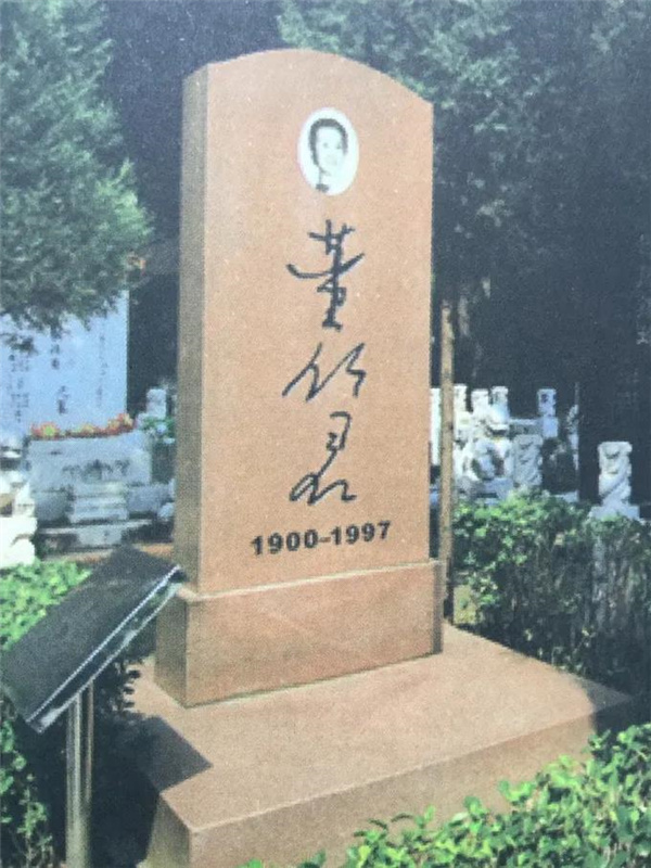董竹君的墓地恰好在万安公墓南北通道的路边上,一座浅棕色的花岗岩墓碑正面刻着:董竹君1900 —1997,碑上端嵌有董竹君端庄、靓丽的人头肖像。