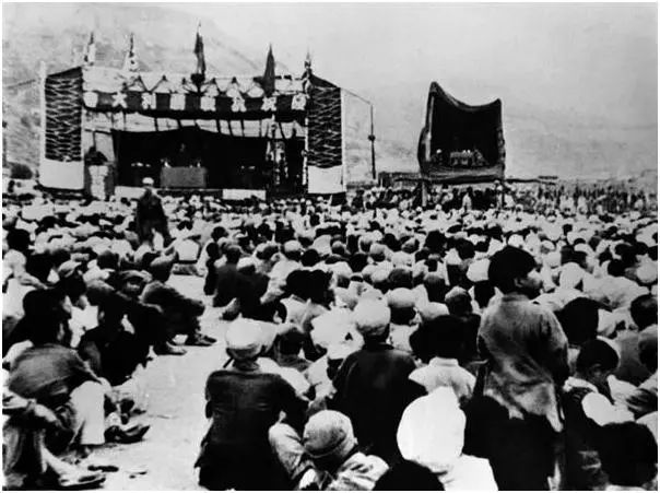 资料图:图为当年延安人民召开庆祝抗日战争胜利群众大会的情景。新华社发