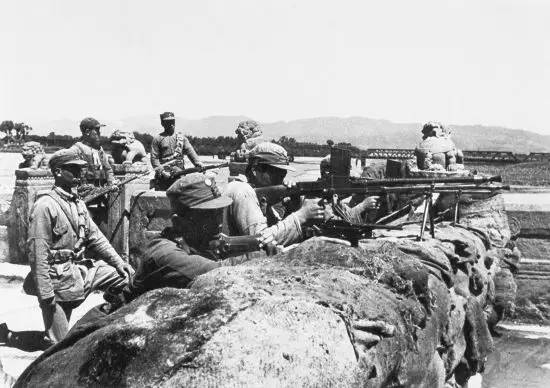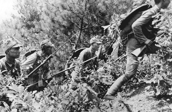 ▲ 1937年,一队中国士兵在江南地区的山林间行进