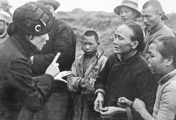 ▲ 在乡间宣传抗战的宋美龄(左一)与农民们交谈