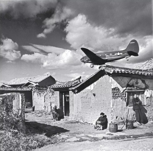 ▲ 1943年,一架准备降落的美国运输机飞过中国的一座村庄