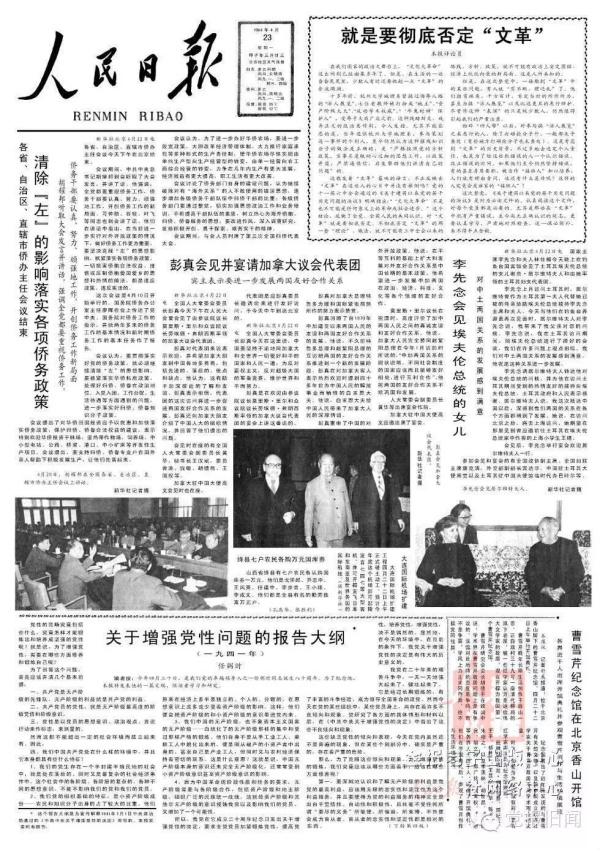 1984年4月23日,本报评论员文章《就是要彻底否定“文革”》,经总编辑李庄审定,在头版报眼位置加框刊出,标题字体用的是超粗黑。当天早上6时30分,中央人民广播电台《新闻和报纸摘要》节目转播这篇评论。