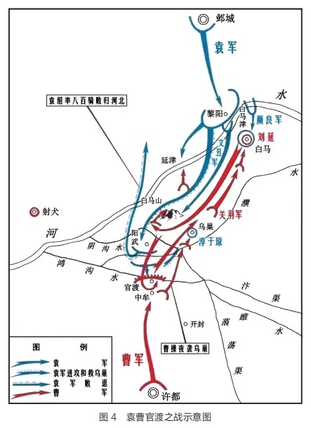 他在战前选择了官渡这个地形与环境非常有利的防御战场来阻击强大的袁军。早在建安四年(199)九月曹操就“分兵守官渡”,开始在当地构筑工事;当年十二月他又亲率主力进驻官渡备战,后来果然凭借那里的坚固阵地以劣势兵力抵住人数庞大的袁军的数月攻击。但曹操并不是一味死守,他的作战灵活机动,能够审时度势,随时出击。先是在袁军先头部队渡河之际北上进攻,取得白马、延津的胜利,再从容撤回官渡。后又在坚守苦战的不利形势下两次发动突袭,烧毁袁军的粮草,致使其军心溃散。曹操不仅计谋过人,而且智勇双全。在强攻乌巢不克的困难局面下,置背后的袁绍骑兵援军于不顾,拒绝分散兵力,仍然孤注一掷地全力攻打乌巢袁营,终于转危为安,一鼓作气拿下敌军营垒,烧毁乌巢的粮草,使整个战局发生逆转。