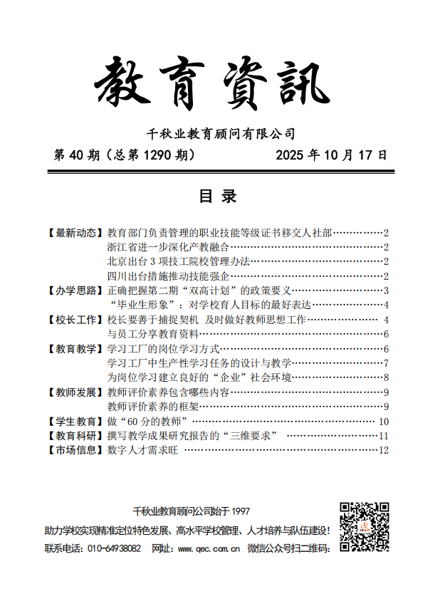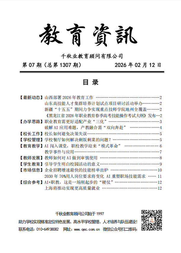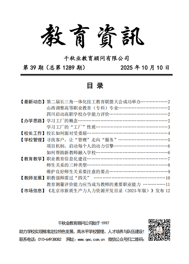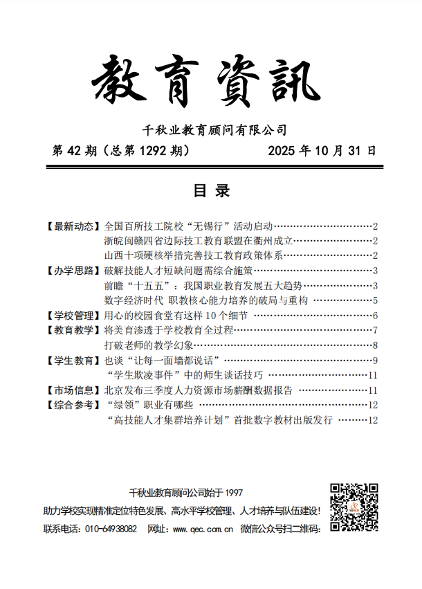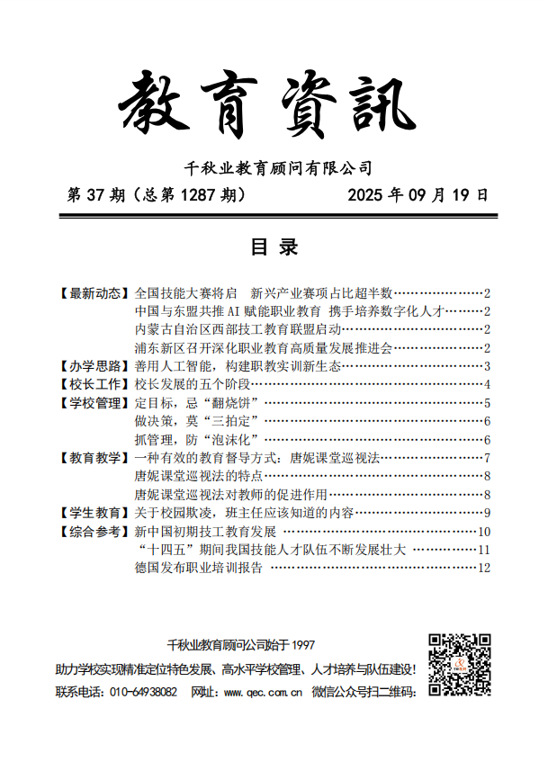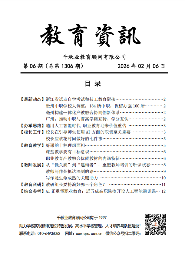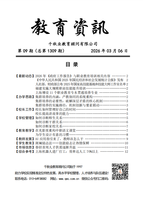 每周一期,荟萃职教最新动态、办学思路、学校管理、校长工作、教育教学、教师发展、学生教育、教育科研、市场消息、综合参考等内容;每月一期专刊,针对职教实事热点与工作重点,提供多维度、多视角资讯参考,用最短的时间,把握当前中国职教的最新动态。