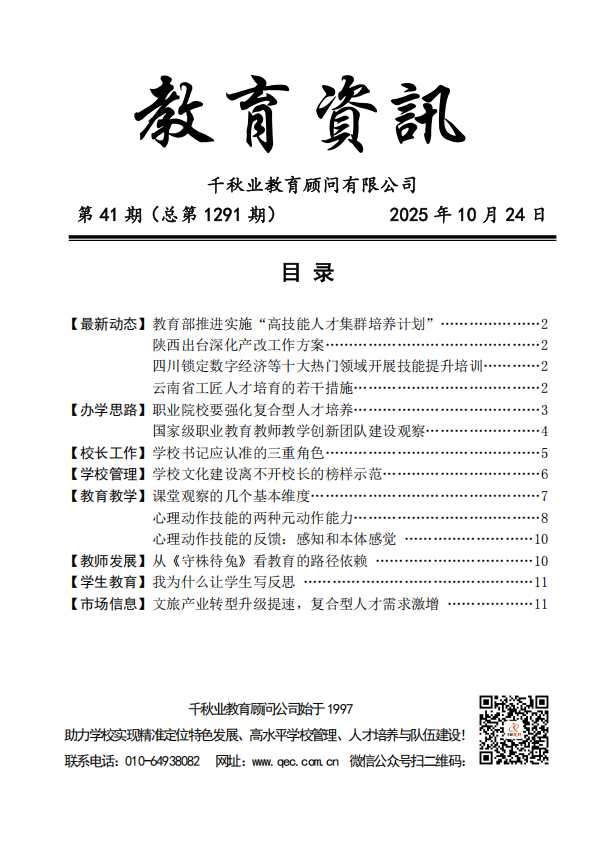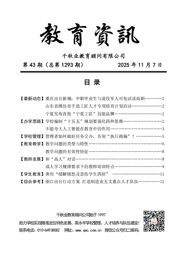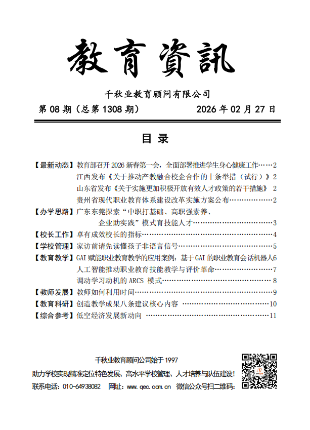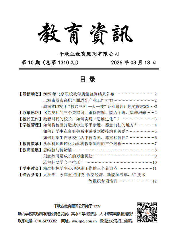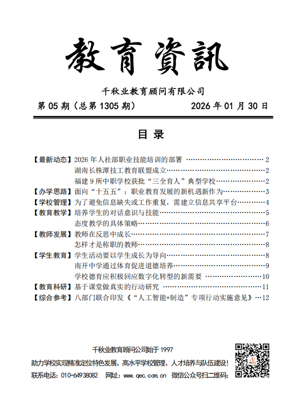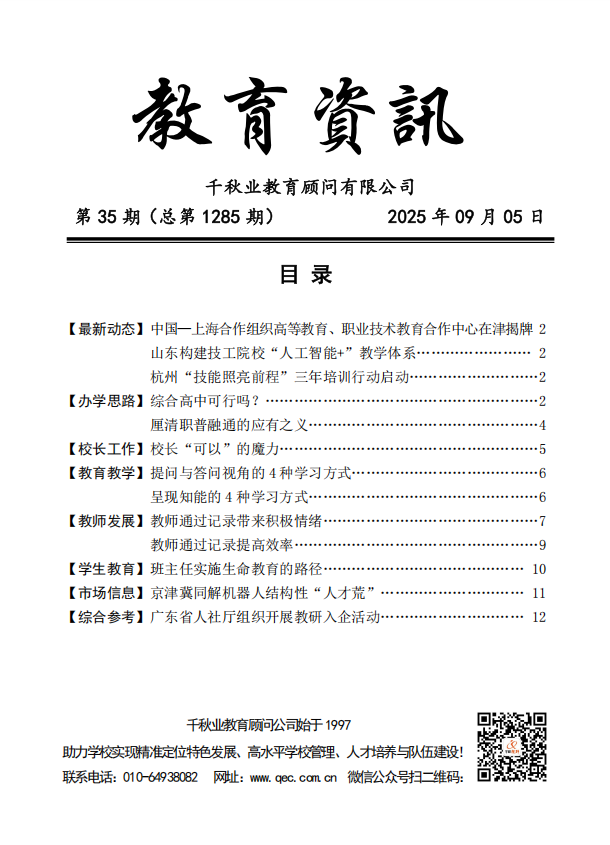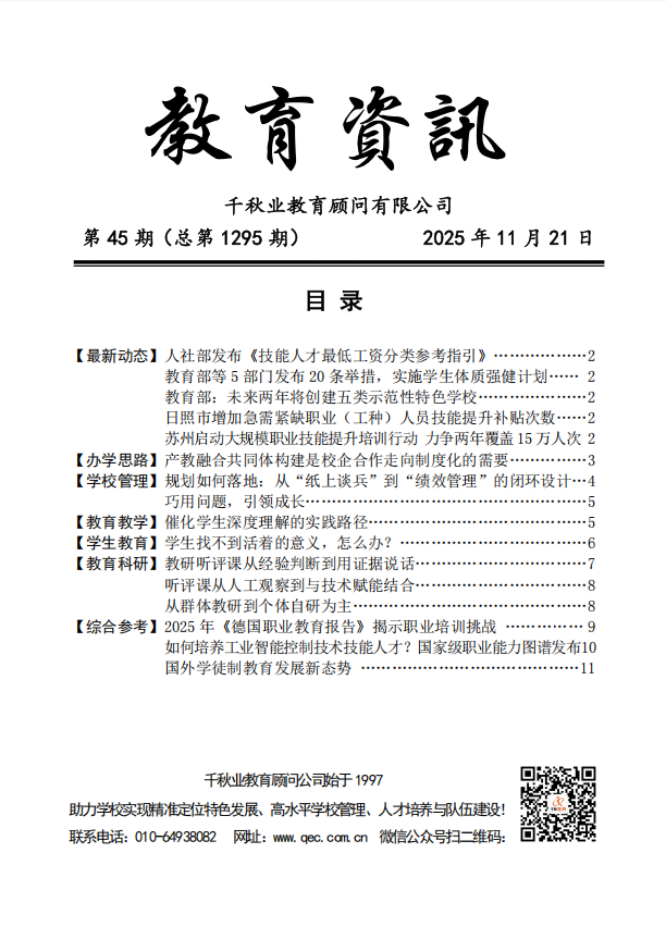每周一期,荟萃职教最新动态、办学思路、学校管理、校长工作、教育教学、教师发展、学生教育、教育科研、市场消息、综合参考等内容;每月一期专刊,针对职教实事热点与工作重点,提供多维度、多视角资讯参考,用最短的时间,把握当前中国职教的最新动态。