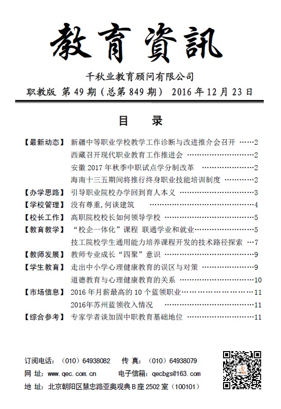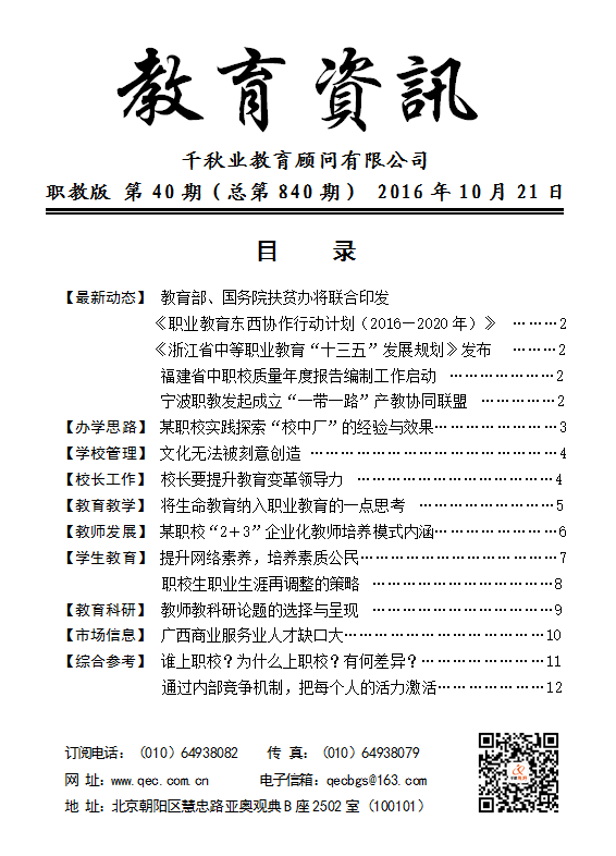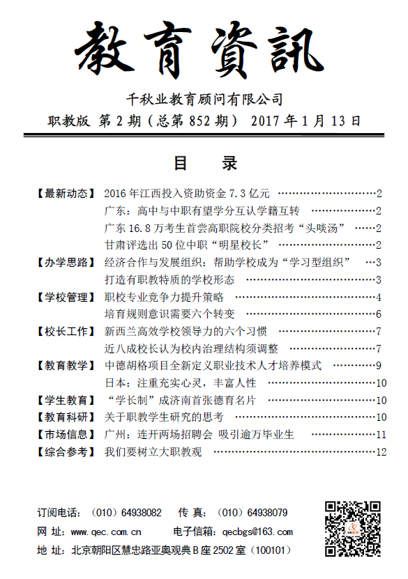 每周一期,荟萃职教最新动态、办学思路、学校管理、校长工作、教育教学、教师发展、学生教育、教育科研、市场消息、综合参考等内容;每月一期专刊,针对职教实事热点与工作重点,提供多维度、多视角资讯参考,用最短的时间,把握当前中国职教的最新动态。