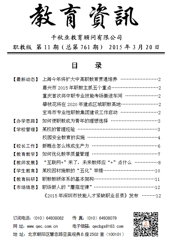 每周一期,荟萃职教最新动态、办学思路、学校管理、校长工作、教育教学、教师发展、学生教育、教育科研、市场消息、综合参考等内容;每月一期专刊,针对职教实事热点与工作重点,提供多维度、多视角资讯参考,用最短的时间,把握当前中国职教的最新动态。